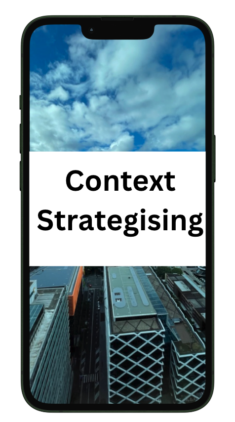 Smartphone screen displaying a sky with clouds and an urban cityscape, with the words 'Context Strategising' in bold black text on a white background.