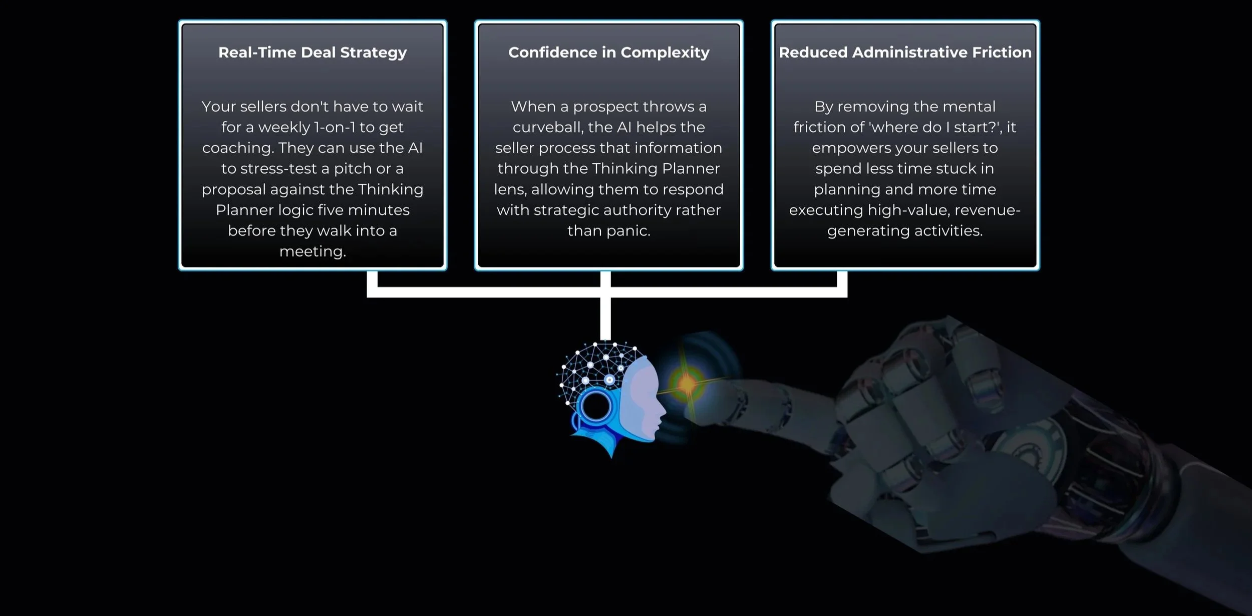 A: Thomas AI works best when embedded into your existing coaching structure: sellers run deal scenarios through Thomas AI before 1:1s, managers review insights in coaching sessions, and it's used for deal reviews, onboarding, and reinforcement of the Thinking Planner discipline.