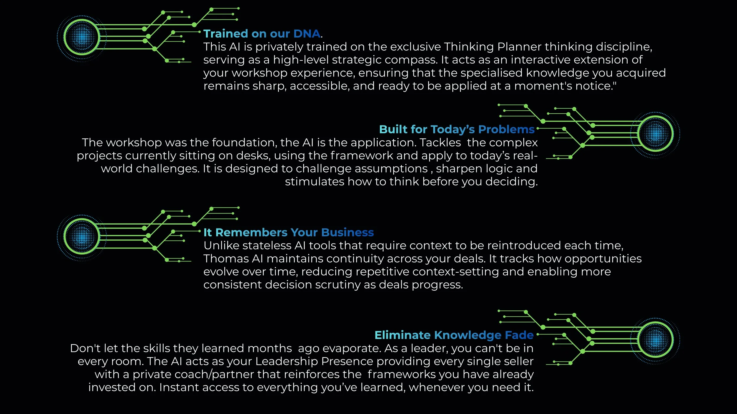 Thomas AI strengthens your strategic thinking and decision-making discipline by: challenging assumptions, separating facts from guesses, generating diagnostic questions, and guiding your thinking through structured coaching to improve the quality of your revenue decisions.